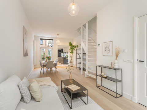 De voorkamer is in gebruik als woonkamer en de eetkamer is gesitueerd aan de achterzijde. In de ruimte onder de trapopgang is een handige bergkast gesitueerd.